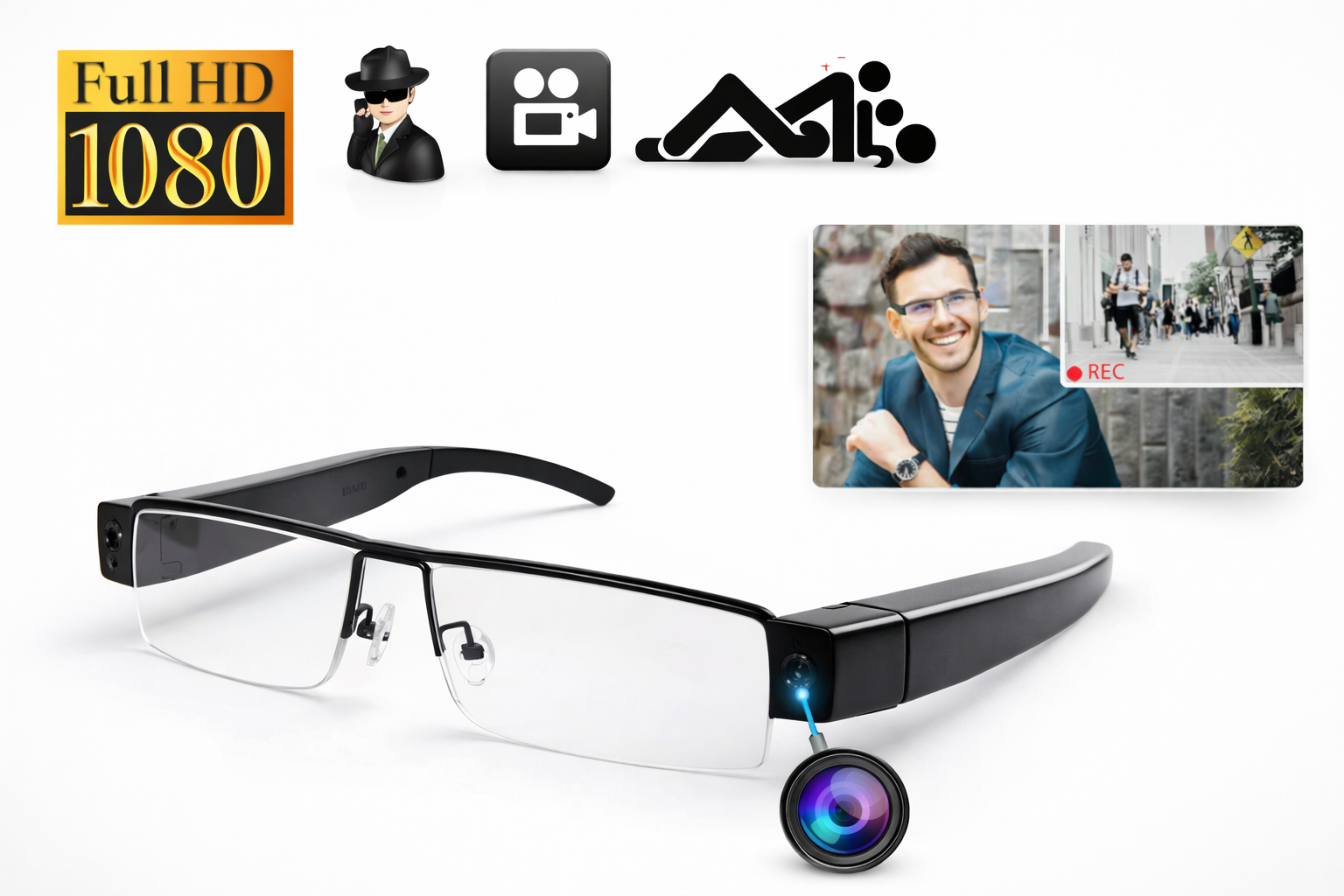 Špionážne okuliare s Full HD kamerou sú veľmi vhodná forma skrytej kamery. Výhoda okuliarov s kamerou, oproti iným skrytým kamerám je taká, že natáčate naozaj to čo chcete, pretože vzhľadom k tomu, že je kamera skrytá v okuliaroch, tak natáča priestor kam sa práve pozeráte, čo u hodiniek, či pier s kamerou nemusí byť pravidlom. Okuliare s Full HD kamerou vám umožní pohodlne natáčať to čo vás naozaj zaujíma. Už vám neunikne žiadny nezabudnuteľný okamih. Ideálne pre zdieľanie zážitkov s priateľmi, klasické aj adrenalínové športy, presadzovanie práva, záznam cesty atď. Z okuliarov nevedú žiadne káble, kamera je absolútne nenápadná a nerozpoznateľná. Stačí stlačiť tlačidlo na boku a spustiť nahrávanie. Vďaka Full HD kamere je možné natáčať aj text, ktorý je na záznamoch čitateľný. Okuliare s Full HD kamerou sú navyše veľmi elegantné a majú skvelý pomer výkon / cena. Okuliare možno opatriť aj dioptrickými sklami.